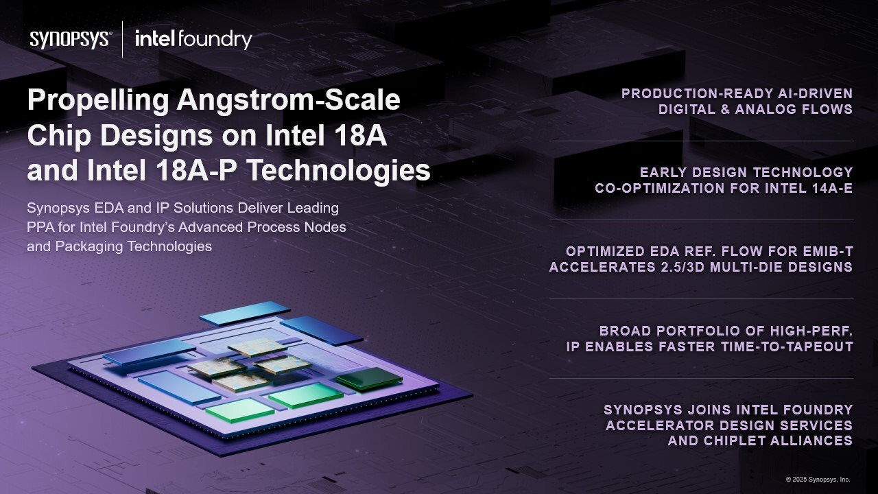 SUNNYVALE, Calif., April 29, 2025 /PRNewswire/ -- At today's Intel Foundry Direct Connect 2025 event, Synopsys, Inc. (Nasdaq: SNPS) announced broad EDA and IP collaborations with Intel Foundry, including availability of its certified AI-driven digital and analog design flows for the Intel 18A process node and production-ready EDA flows for the Intel 18A-P process node with RibbonFET Gate-all-around transistor architecture and the industry's first commercial foundry implementation of PowerVia backside power delivery.